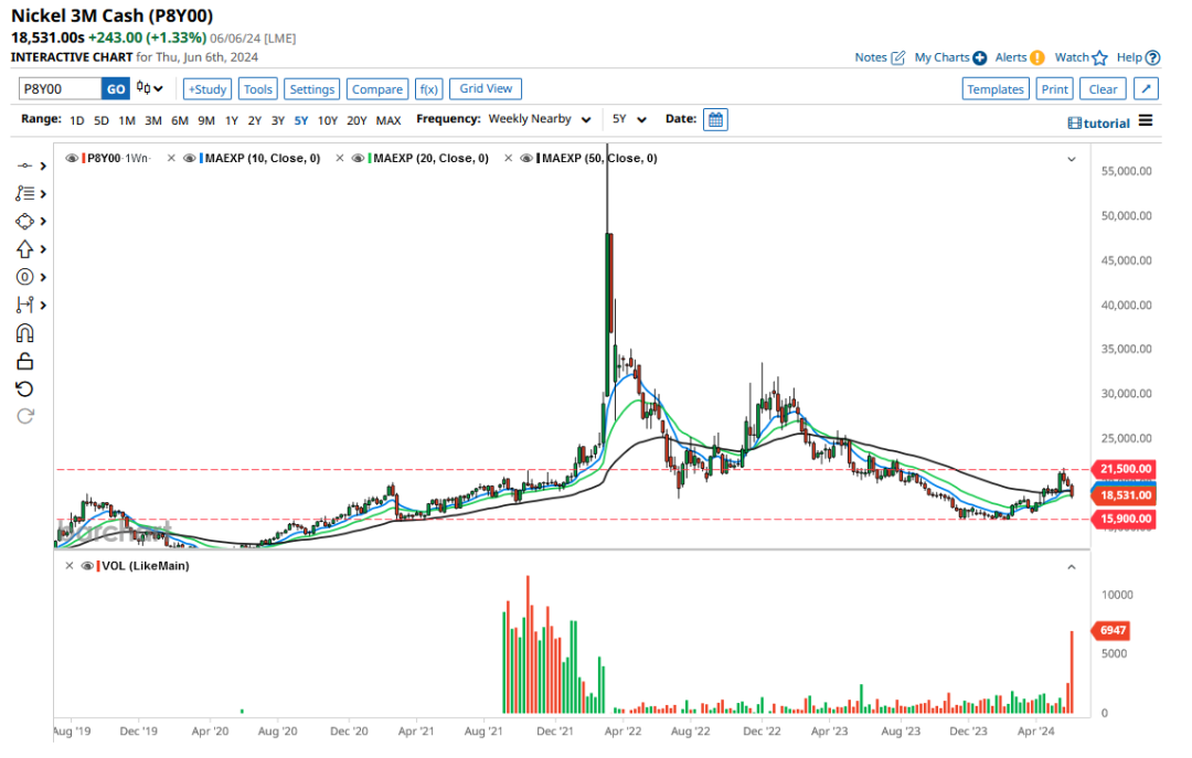 鎳在15900點有牢固的支撐,在21500點有很強的阻力。