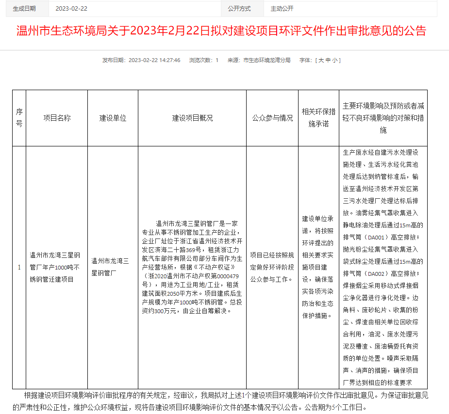 2月21日,溫州市生態(tài)環(huán)境局龍灣分局就溫州市龍灣三星鋼管廠年產(chǎn)1000噸不銹鋼管遷建項(xiàng)目環(huán)境影響評(píng)價(jià)報(bào)告表作出審批意見并對(duì)外進(jìn)行公告,公告期:5個(gè)工作日。
