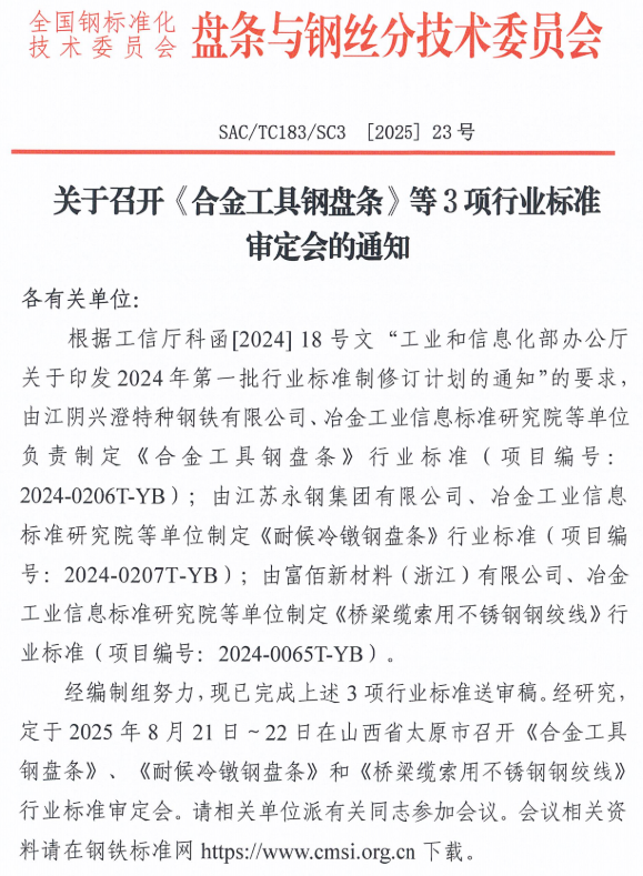 2025年8月4日,由由富佰新材料(浙江)有限公司、冶金工業(yè)信息標(biāo)準(zhǔn)研究院等單位制定《橋梁纜索用不銹鋼鋼絞線》等3項(xiàng)行業(yè)標(biāo)準(zhǔn)已完成標(biāo)準(zhǔn)送審稿,將于2025年8月21日-22日在山西省太原市召開業(yè)標(biāo)準(zhǔn)審定會。